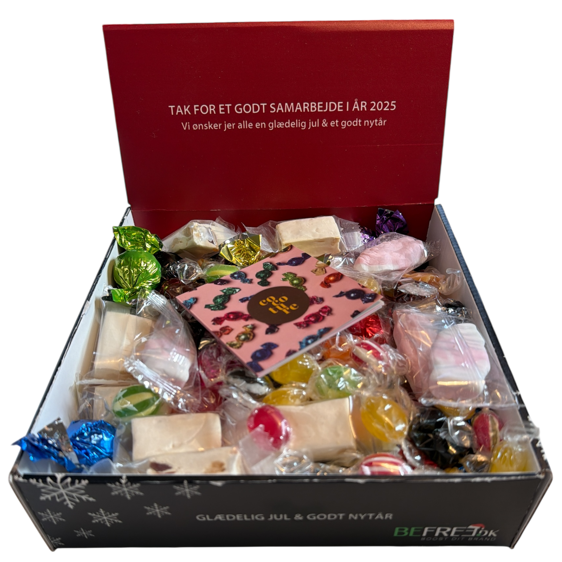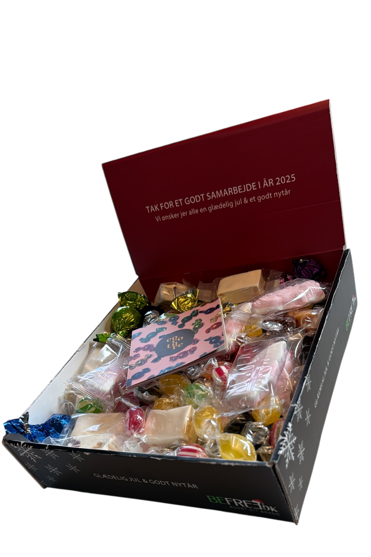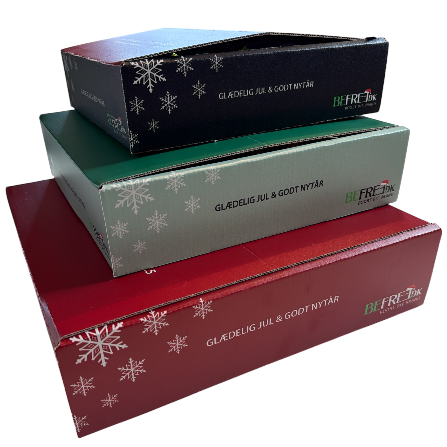 Størrelse på gavekasser | 1 kg. kasse = B 22 x 23 x 6,5 cm. |
